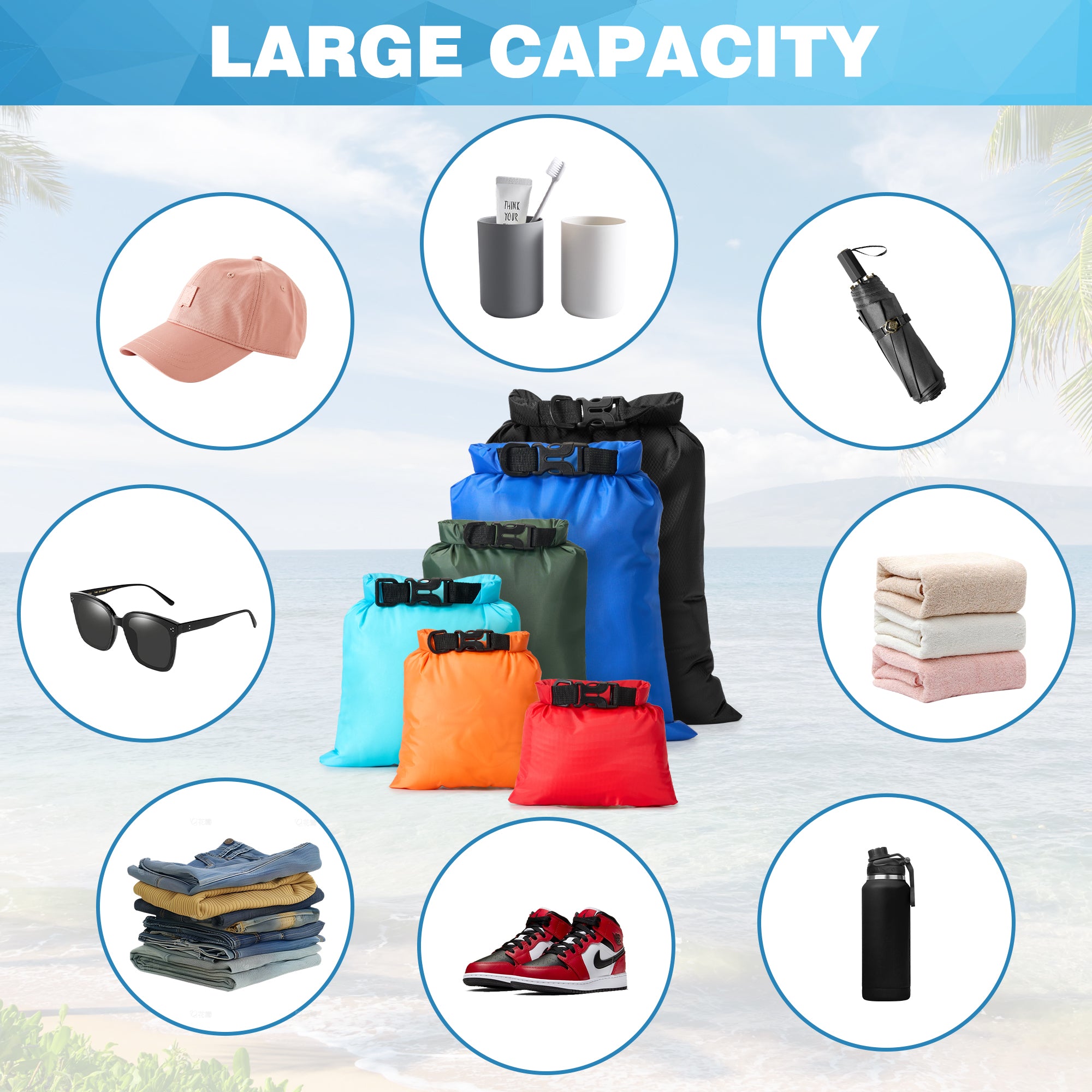 Bescherm al je spullen tegen water, stof en vuil met de YONO Dry Bag 6-Pack – een complete set waterdichte tassen in zes handige maten. Of je nu gaat kamperen, varen, kajakken, wandelen of gewoon je uitrusting wilt beschermen tegen regen en modder – met deze veelzijdige set heb je altijd de juiste maat dry bag bij de hand. De YONO Dry Bag 6-Pack is ideaal voor het organiseren én beschermen van al je spullen. Van je smartphone en portemonnee tot kleding en kampeergerei – alles blijft droog en schoon. Dankzij de roll-top sluiting en het duurzame, waterdichte materiaal zijn deze tassen betrouwbaar in elke situatie.