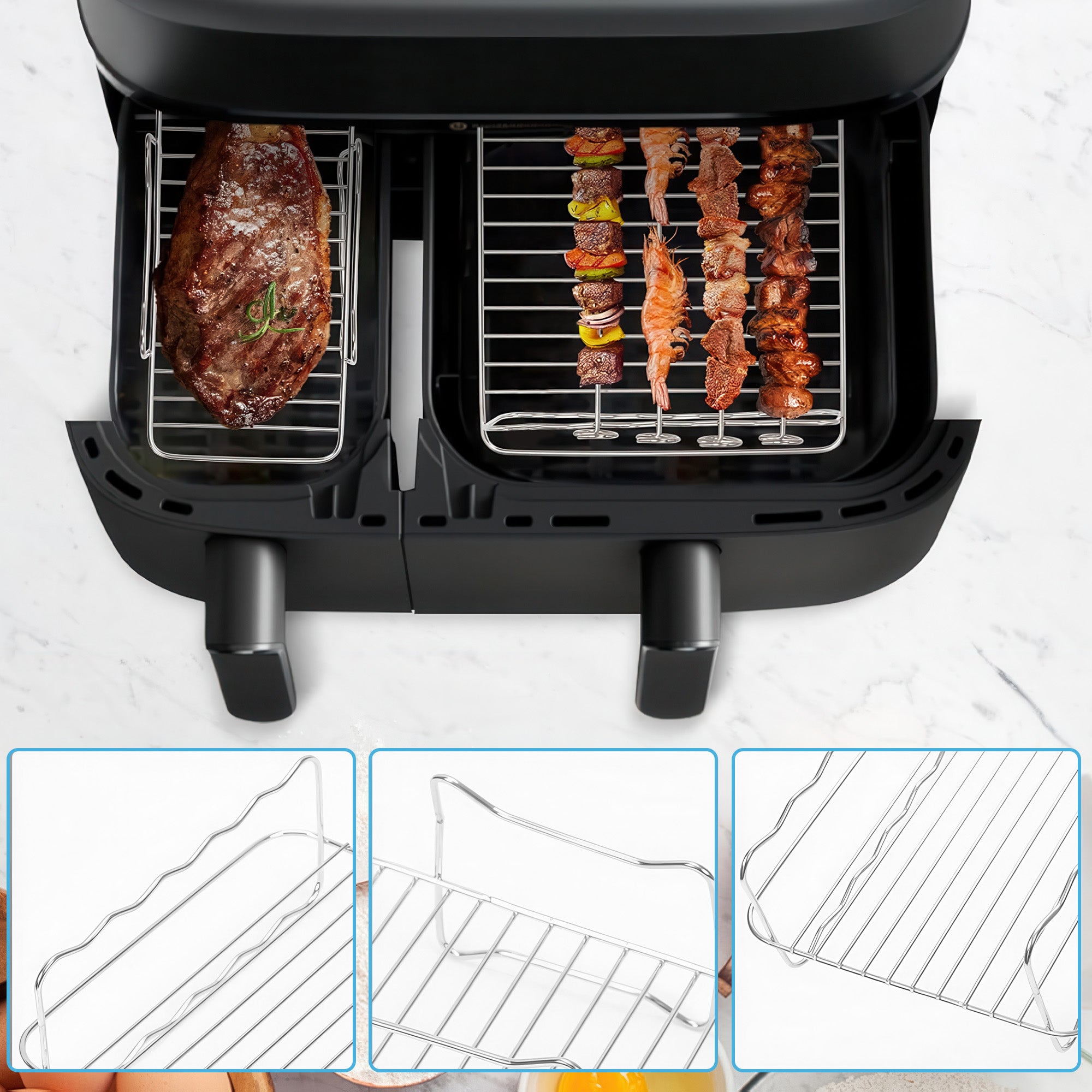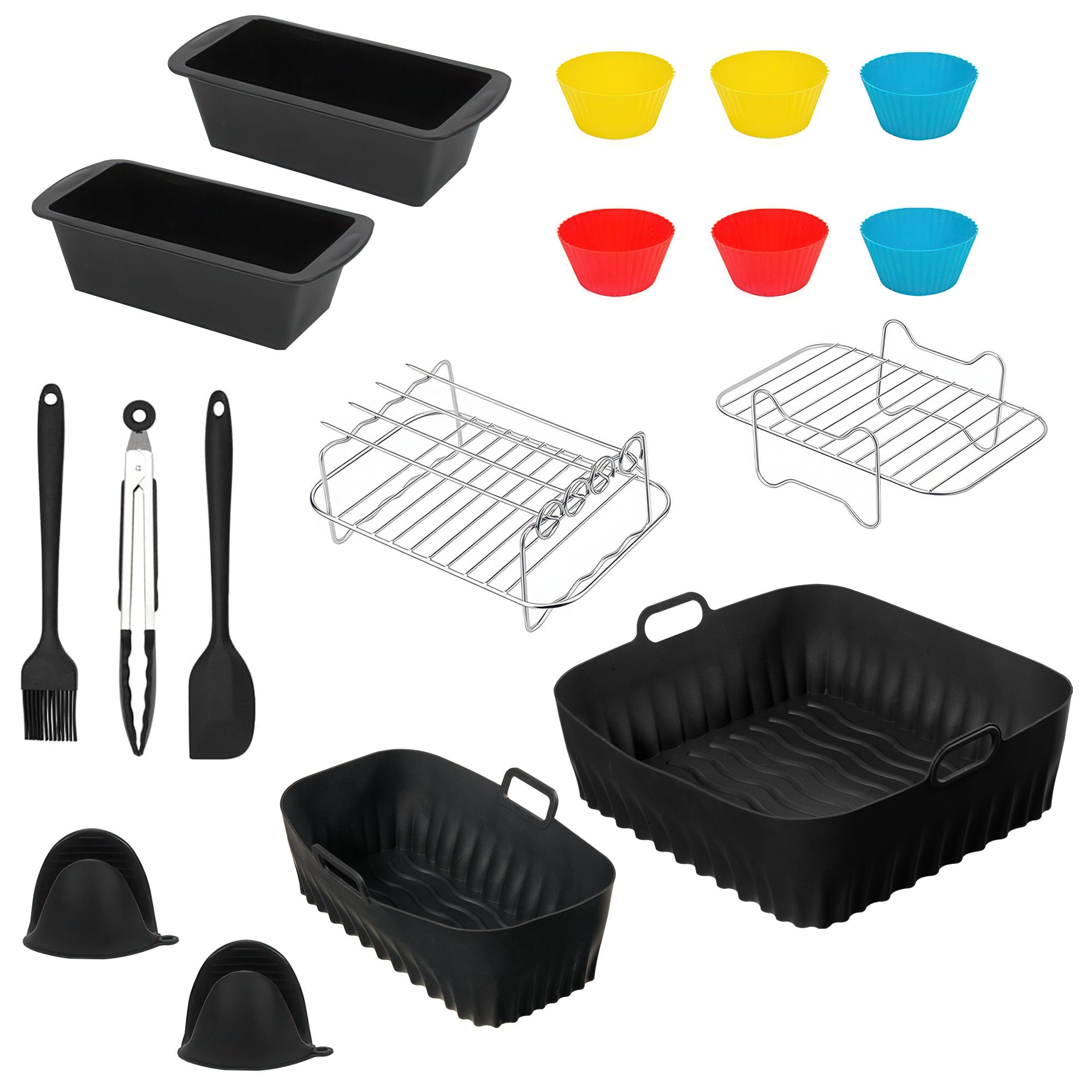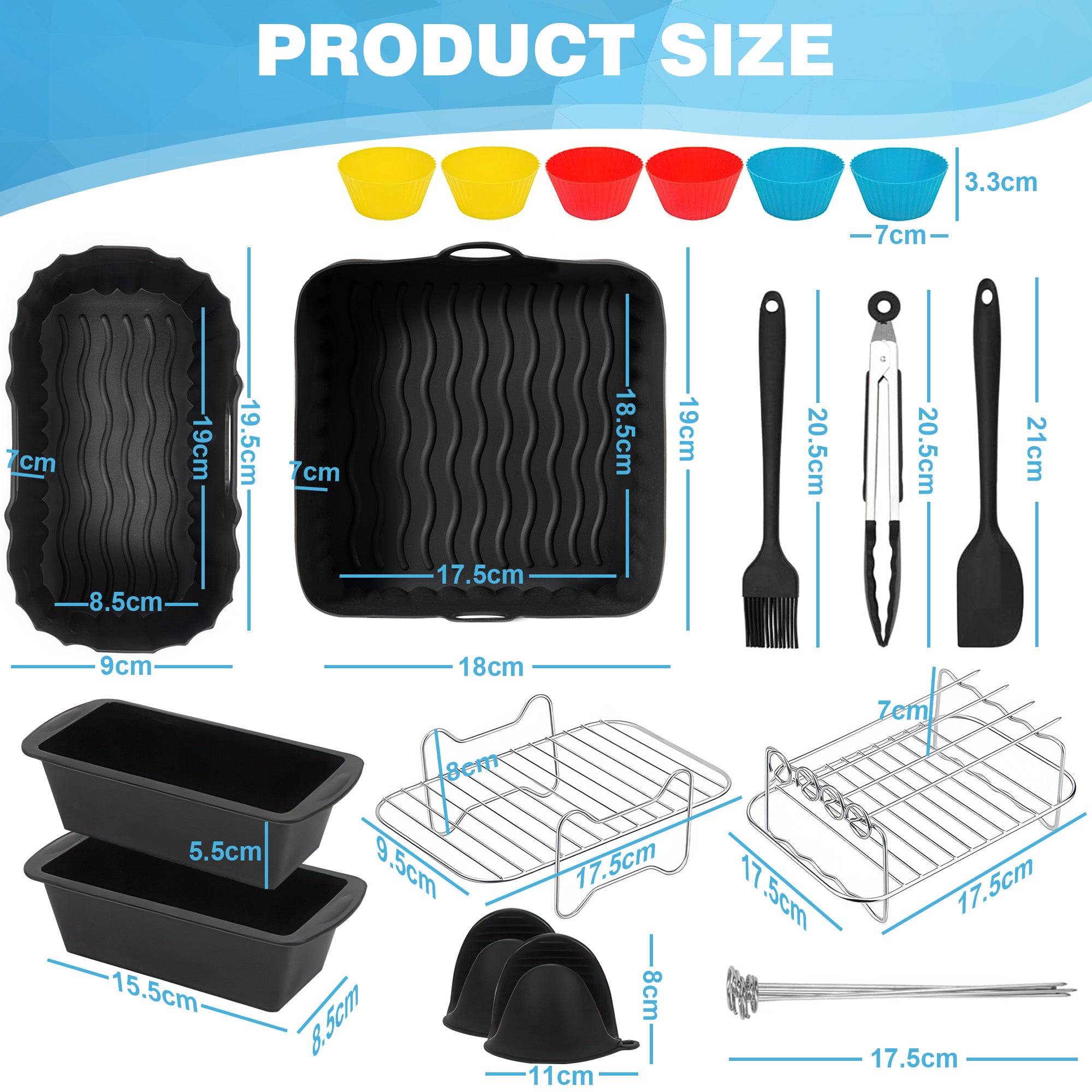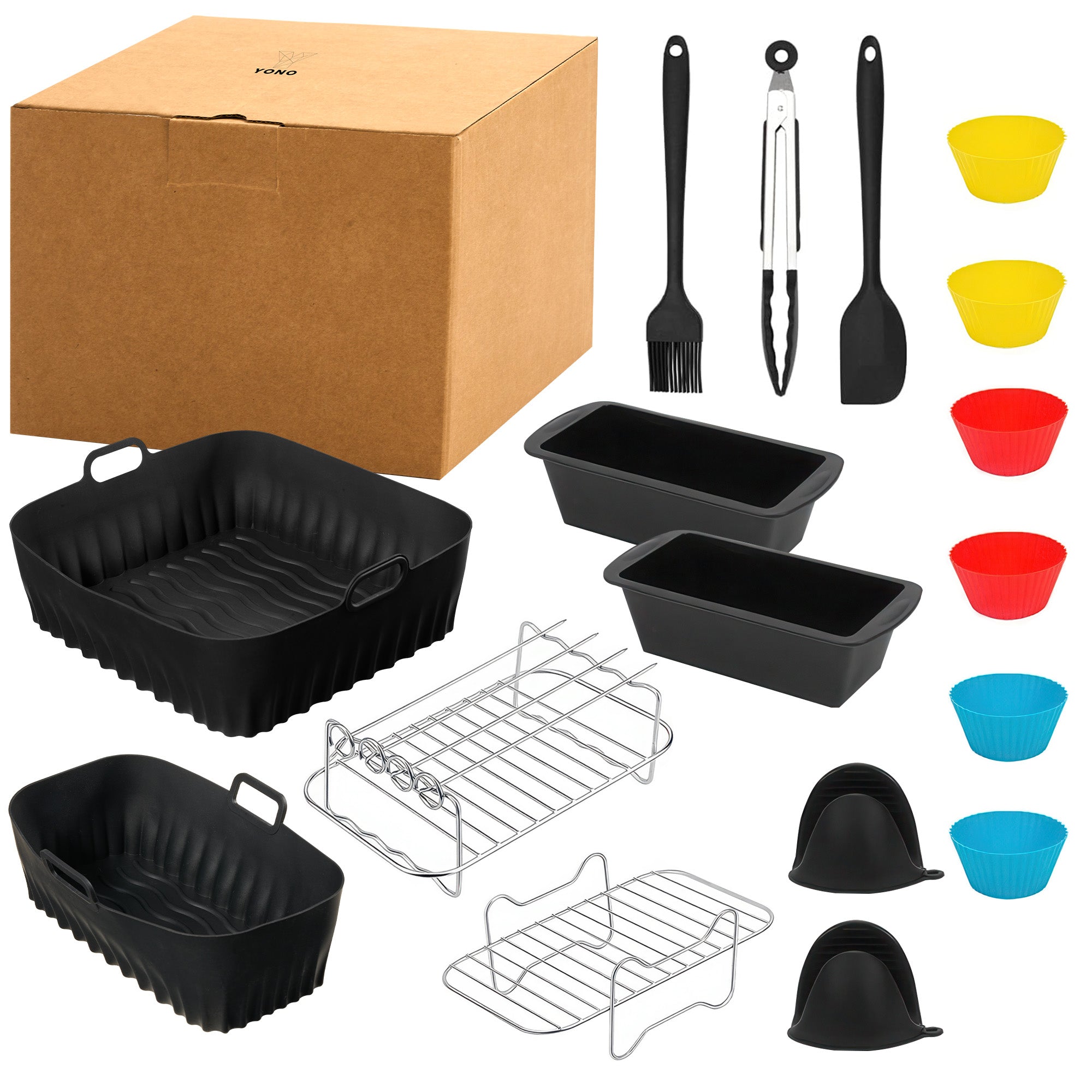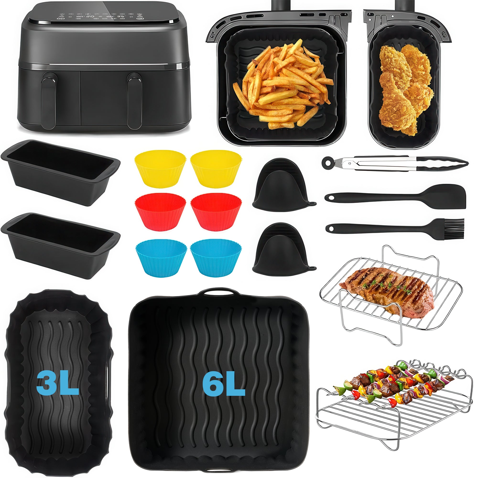 Ontdek de ultieme YONO 18-in-1 Airfryer Accessoireset, speciaal 1-op-1 op maat ontworpen voor de Philips Dual Basket Airfryer 3000 en 5000 Series. Ben jij op zoek naar perfect passende airfryer accessoires, hoogwaardige BPA-vrije siliconen bakjes, stevige RVS grillrekjes, handige bakvormen en een complete set hulpmiddelen om nóg meer uit jouw airfryer te halen? Dan is deze YONO set dé upgrade die jouw keuken verdient. Met deze uitgebreide airfryer accessoireset verander je jouw Philips airfryer in een veelzijdige mini-oven waarmee je bakken, braden, grillen, roosteren en zelfs cake maken moeiteloos combineert. De set bevat uitsluitend accessoires die precies passen in beide baskets van de Philips Dual Basket, waardoor je nooit hoeft te puzzelen met verkeerde maten. De siliconen bakjes zijn gemaakt van premium, hittebestendig en BPA-vrij materiaal en beschikken over verstevigde handgrepen die van de rand van de pan af staan. Hierdoor til je ze altijd gemakkelijk en veilig uit de airfryer. Dankzij de textuur in de bodem wordt overtollig vet automatisch afgevoerd en circuleert de hete lucht optimaal voor een nóg krokanter resultaat. Naast de bakjes bevat de set ook RVS grillrekjes en spiezen, ideaal voor krokante kip, groenten, shaslicks, vis en vleesgerechten. De cupcakevormpjes, cakevormen, spatel, bakkwast, tang en pannengreepjes maken de set compleet en geven je werkelijk álles wat je nodig hebt om nieuwe recepten uit te proberen.