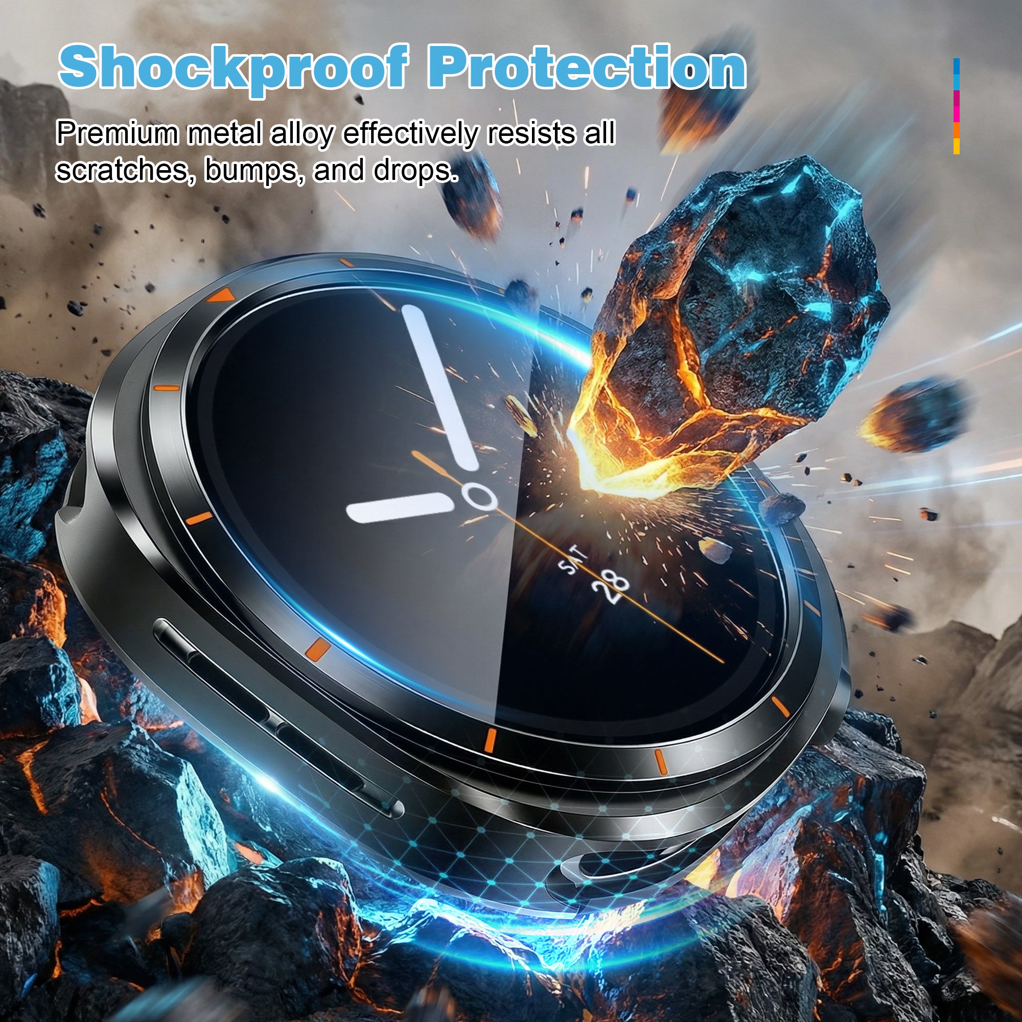 De case is vervaardigd uit hoogwaardig RVS (roestvrij staal) en beschikt over een geïntegreerde screen protector van gehard glas. Hierdoor wordt niet alleen de rand, maar ook het scherm van je smartwatch optimaal beschermd tegen beschadigingen. De helderheid en touchgevoeligheid van het display blijven volledig behouden, zodat je de Samsung Watch 8 net zo soepel blijft bedienen als zonder hoesje.