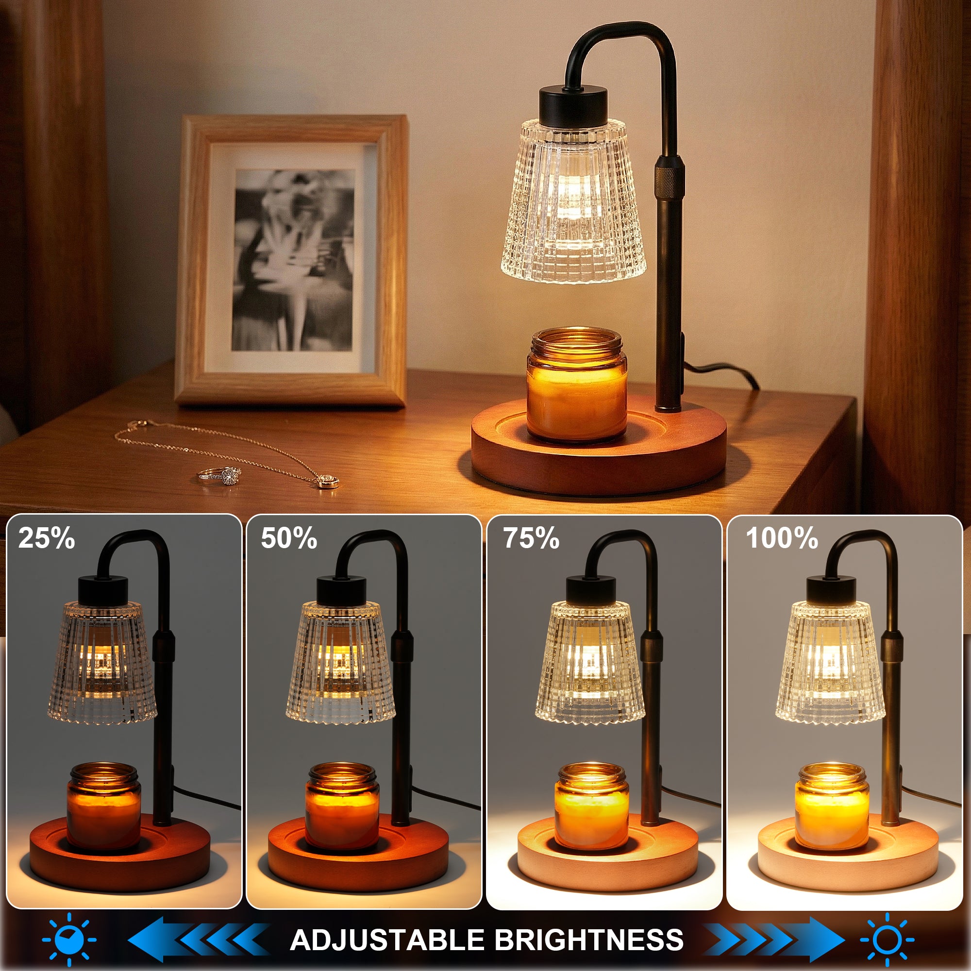 Dankzij de instelbare helderheid bepaal je zelf hoe intens de warmte en geurverspreiding is. De ingebouwde timerfunctie (2, 4, 8 of 10 uur) schakelt de lamp automatisch uit, ideaal voor gebruik in de avond of tijdens het slapen. Het elegante zwarte design met glazen kap en houten voet past perfect in elk interieur, van modern tot klassiek.