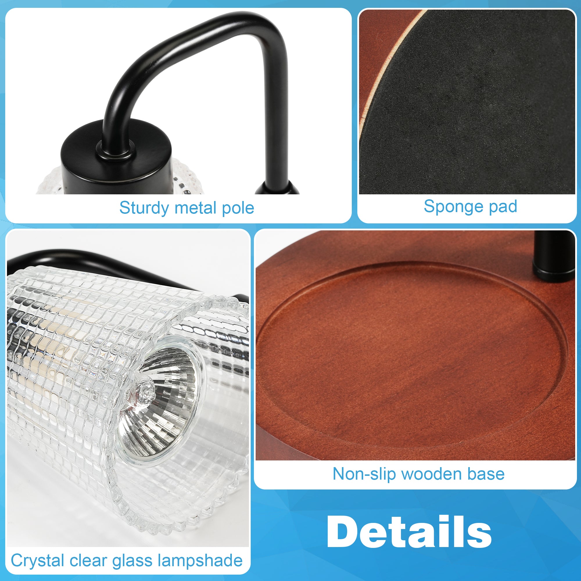 De kristalheldere glazen lampenkap zorgt voor een zachte, warme lichtverdeling, terwijl de stevige metalen arm stabiliteit biedt. De antislip houten voet houdt de kaars netjes op zijn plek en beschermt je meubels. Dankzij het compacte formaat is de lamp perfect voor de woonkamer, slaapkamer, badkamer of kantoor.