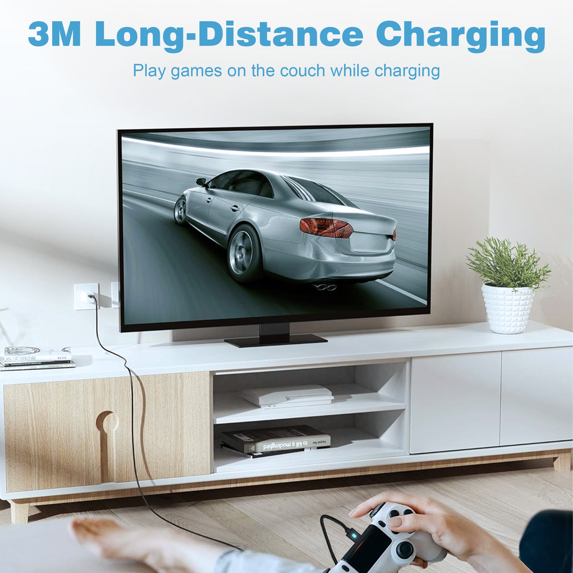 De YONO Extra Lange Oplaadkabel van 3 meter biedt maximale bewegingsvrijheid tijdens gamen of werken. De USB-A naar USB-C kabel is geschikt voor o.a. PS5- en Xbox-controllers, smartphones en andere apparaten. Het duurzame gevlochten nylon voorkomt knopen en maakt de kabel extra stevig, terwijl het lichte gewicht hem makkelijk meeneembaar maakt. Dankzij het indicatielampje zie je direct of de verbinding werkt en naast opladen ondersteunt de kabel ook gegevensoverdracht.