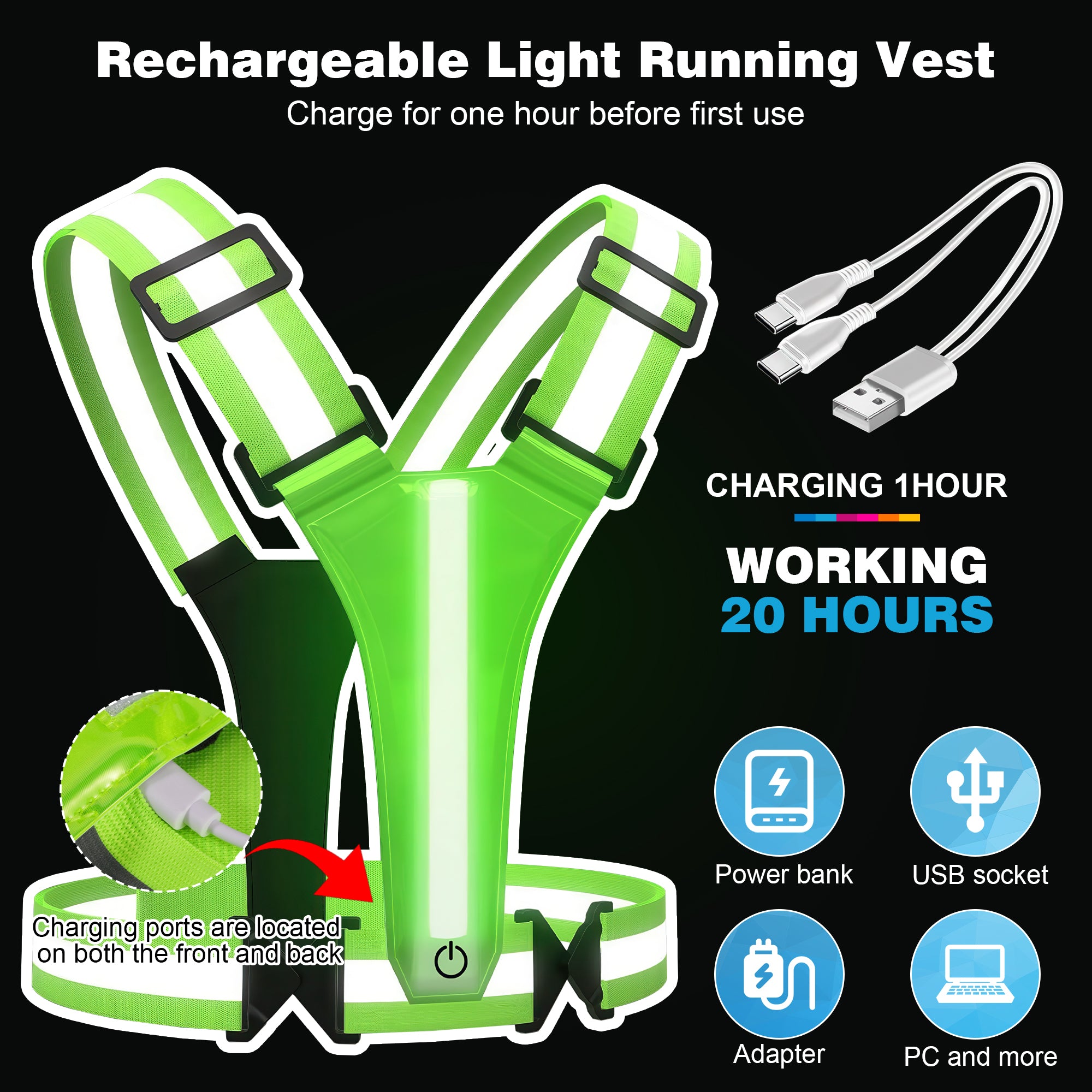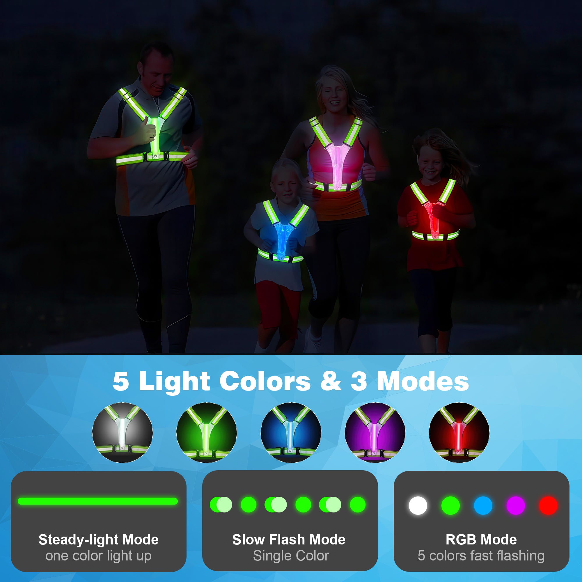 Het hardloopvest beschikt over 5 verschillende lichtkleuren (wit, groen, blauw, paars en rood) en 3 lichtstanden: continu licht, langzaam knipperen en een dynamische RGB-modus. Zo kies je altijd de stand die past bij jouw activiteit, omgeving of persoonlijke voorkeur. De LED-verlichting is zowel aan de voor- als achterkant geplaatst, wat zorgt voor 360° zichtbaarheid.