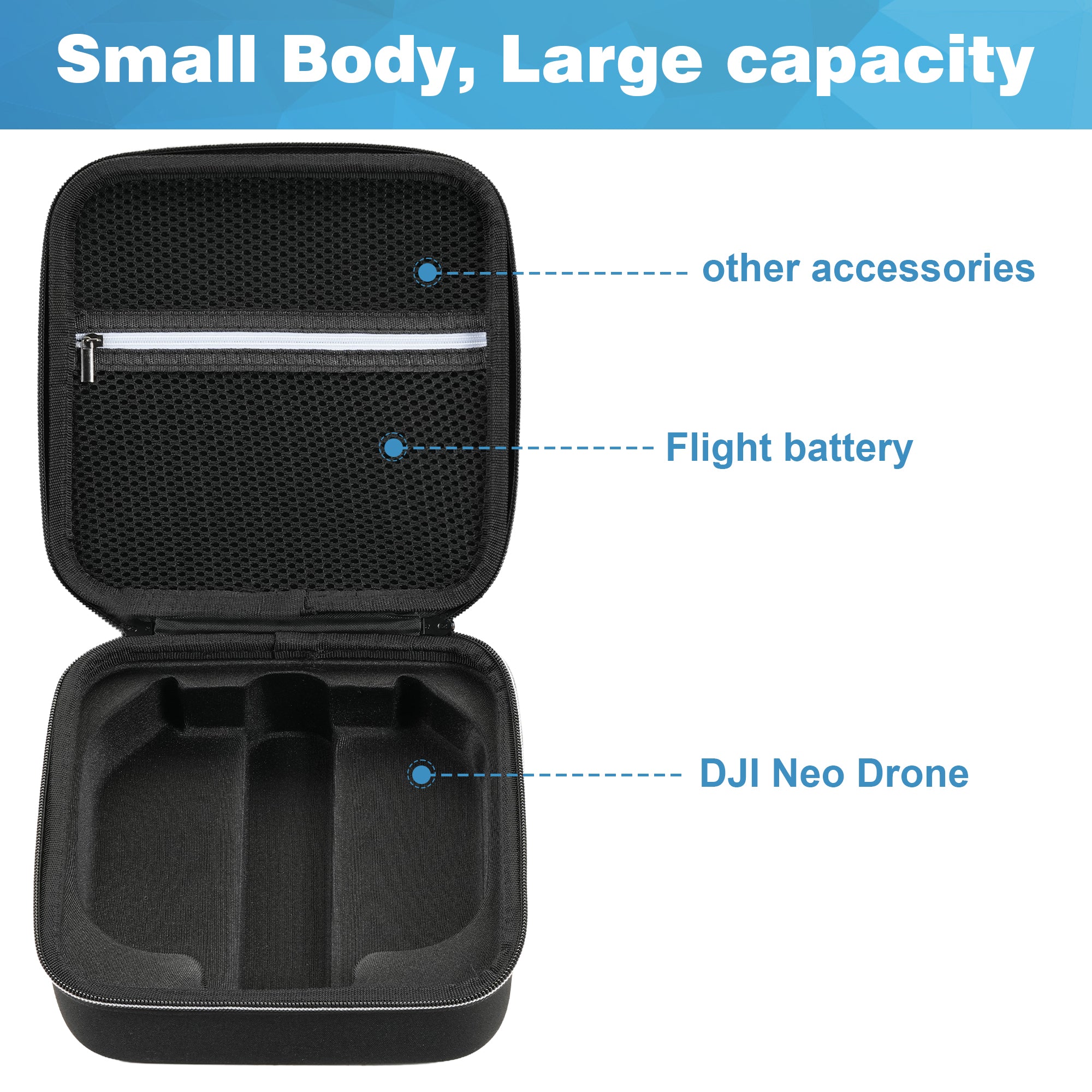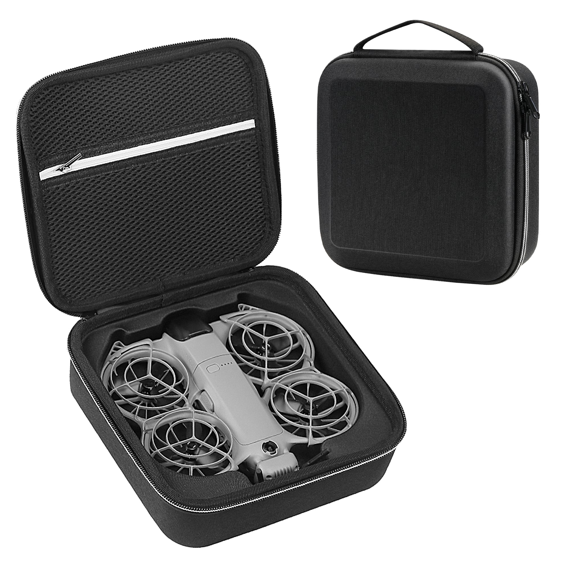 De buitenkant van de koffer is gemaakt van hoogwaardig EVA-materiaal, bekend om zijn uitstekende schokabsorberende eigenschappen. Dit beschermt je DJI Neo 2 tegen vallen, stoten en druk van buitenaf. Daarnaast is het materiaal vormvast en slijtvast, waardoor de koffer langdurig meegaat en geschikt is voor intensief gebruik.