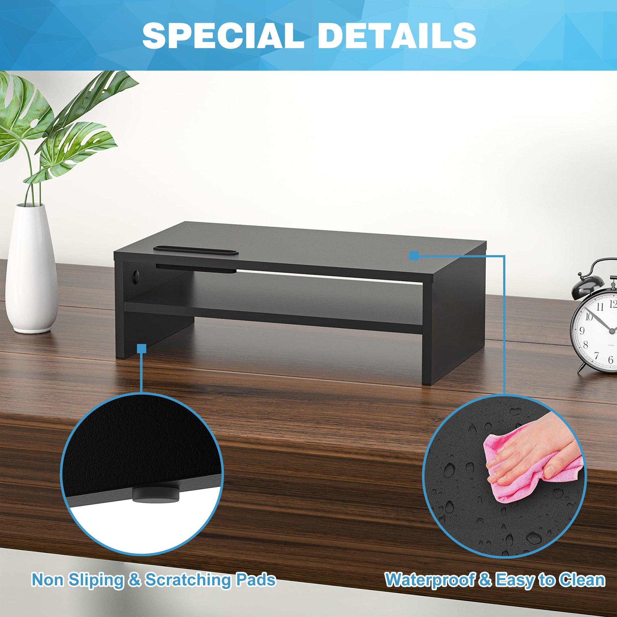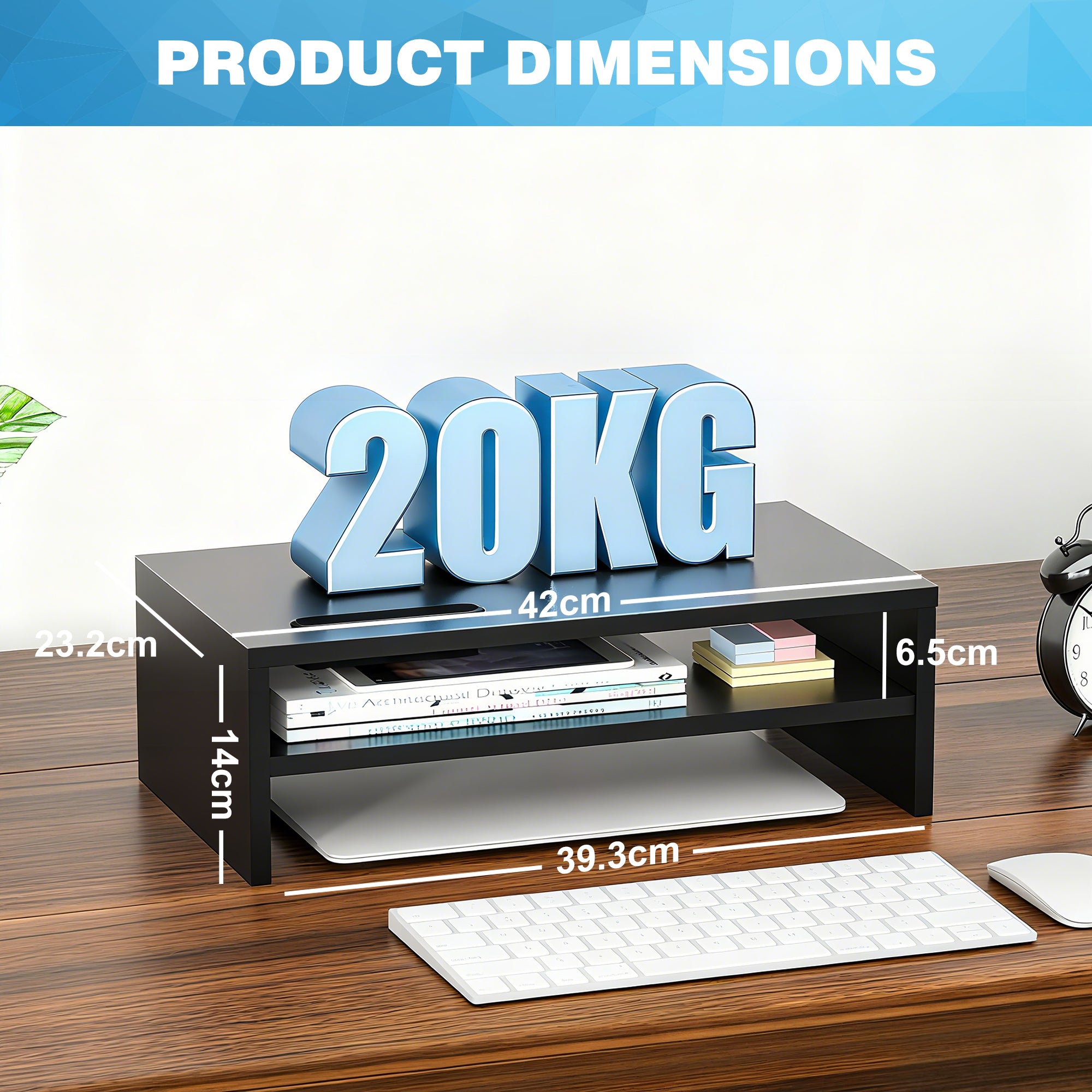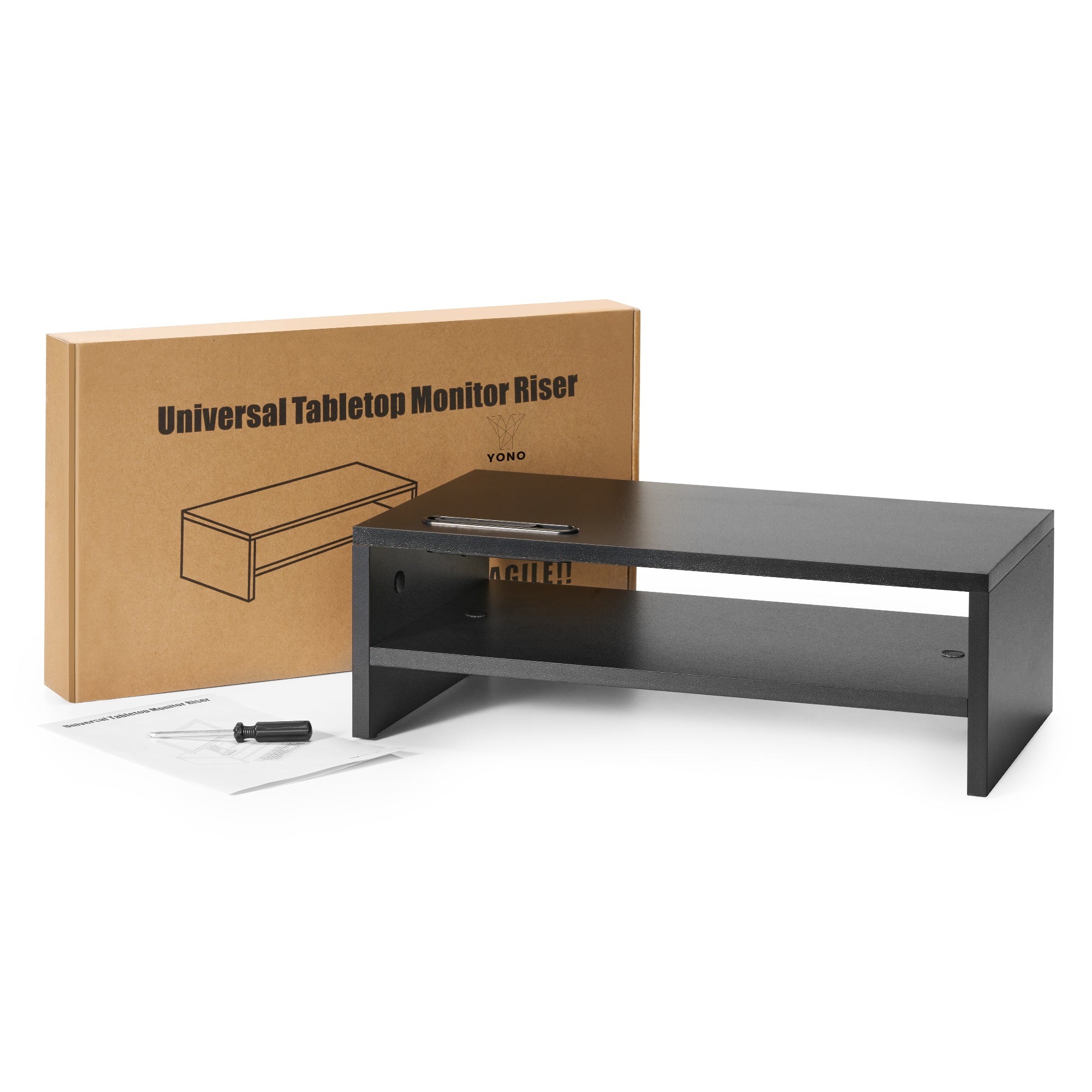 Til je werkplek naar een hoger niveau met de YONO Monitor Standaard – Beeldscherm Verhoger met Telefoonhouder. Deze stijlvolle bureau-organizer combineert functionaliteit met een strak houten design in zwart, perfect voor elke moderne werkplek. Dankzij het ergonomische ontwerp werk je comfortabeler en creëer je direct extra ruimte op je bureau. De praktische uitsparing biedt een vaste plek voor je telefoon, terwijl de antislip- en krasbestendige pads helpen om kabels netjes te ordenen. Met een tussenplank op 6,5 cm hoogte berg je moeiteloos je toetsenbord, documenten of accessoires op. De standaard is waterproof, duurzaam en eenvoudig schoon te maken, met zachte beschermdopjes aan de onderzijde om krassen op je bureau te voorkomen. Met een draagvermogen tot 20 kg is deze monitor verhoger ideaal voor beeldschermen, laptops, printers of andere accessoires. Inclusief alle benodigdheden en een duidelijke handleiding voor eenvoudige montage.