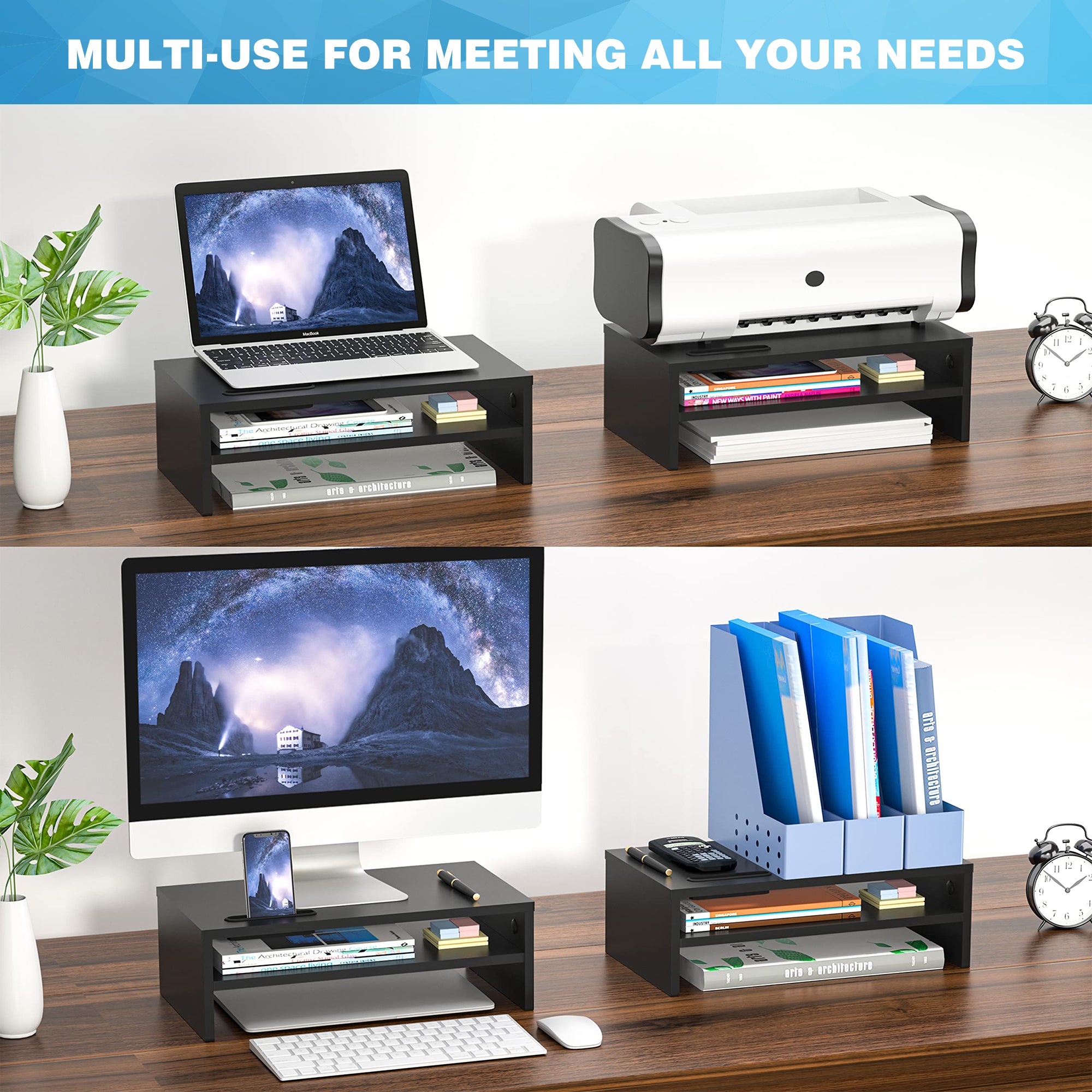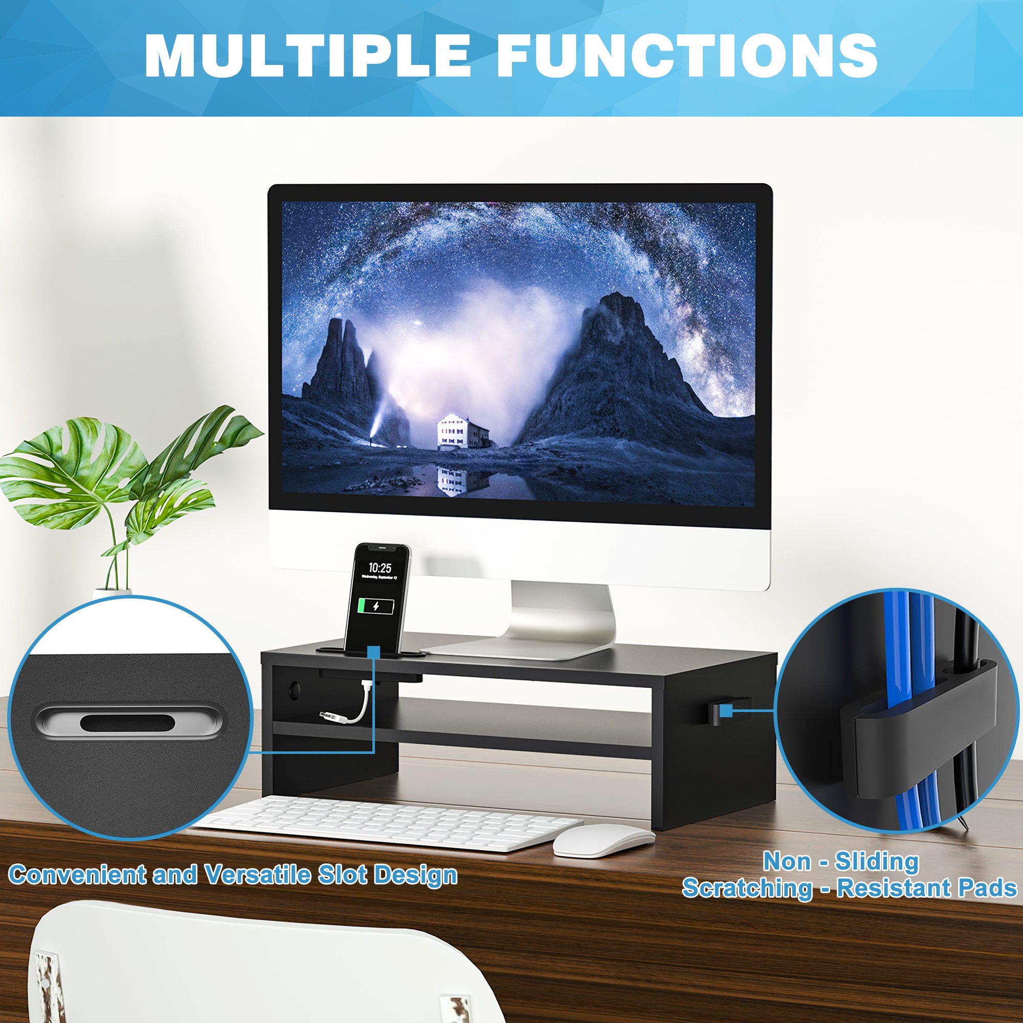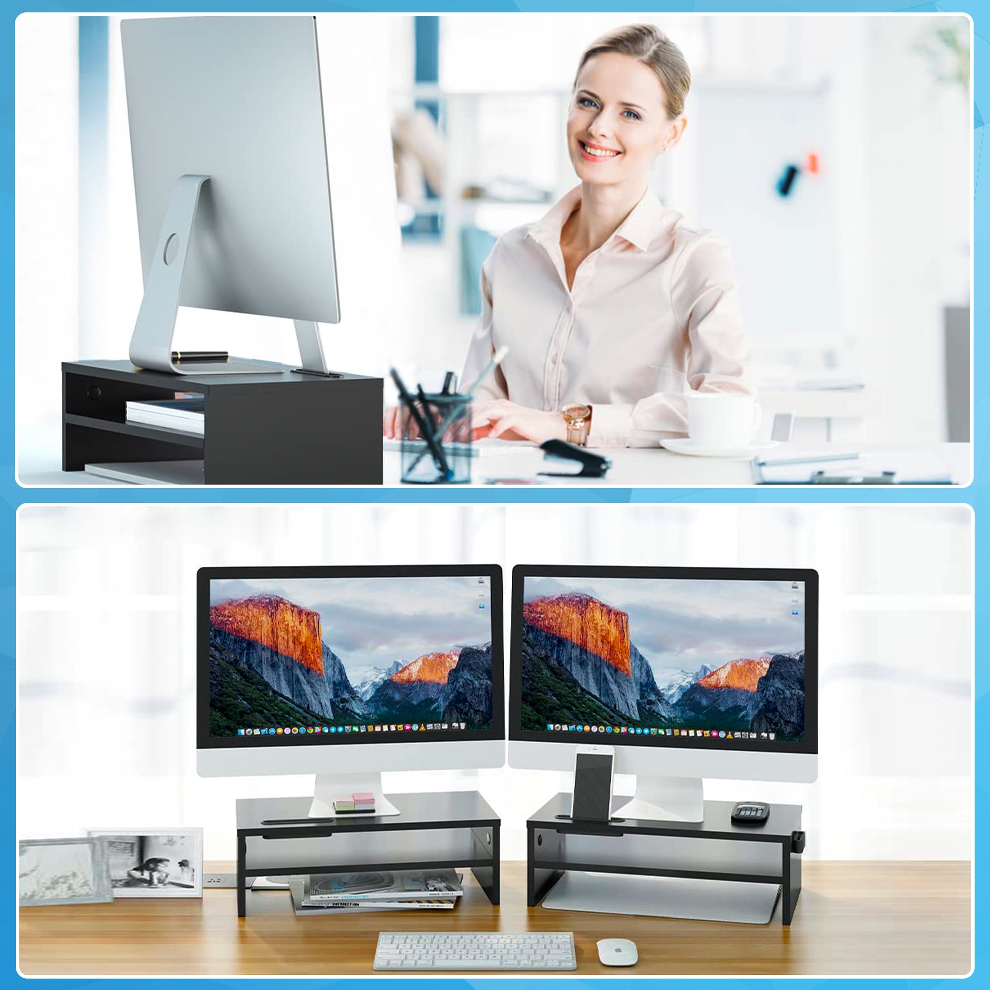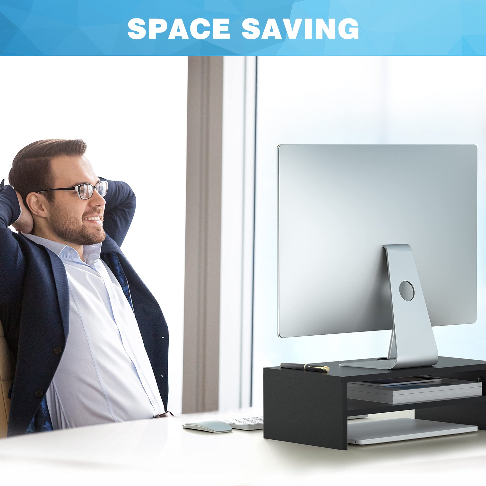 Til je werkplek naar een hoger niveau met de YONO Monitor Standaard – Beeldscherm Verhoger met Telefoonhouder. Deze stijlvolle bureau-organizer combineert functionaliteit met een strak houten design in zwart, perfect voor elke moderne werkplek. Dankzij het ergonomische ontwerp werk je comfortabeler en creëer je direct extra ruimte op je bureau. De praktische uitsparing biedt een vaste plek voor je telefoon, terwijl de antislip- en krasbestendige pads helpen om kabels netjes te ordenen. Met een tussenplank op 6,5 cm hoogte berg je moeiteloos je toetsenbord, documenten of accessoires op. De standaard is waterproof, duurzaam en eenvoudig schoon te maken, met zachte beschermdopjes aan de onderzijde om krassen op je bureau te voorkomen. Met een draagvermogen tot 20 kg is deze monitor verhoger ideaal voor beeldschermen, laptops, printers of andere accessoires. Inclusief alle benodigdheden en een duidelijke handleiding voor eenvoudige montage.