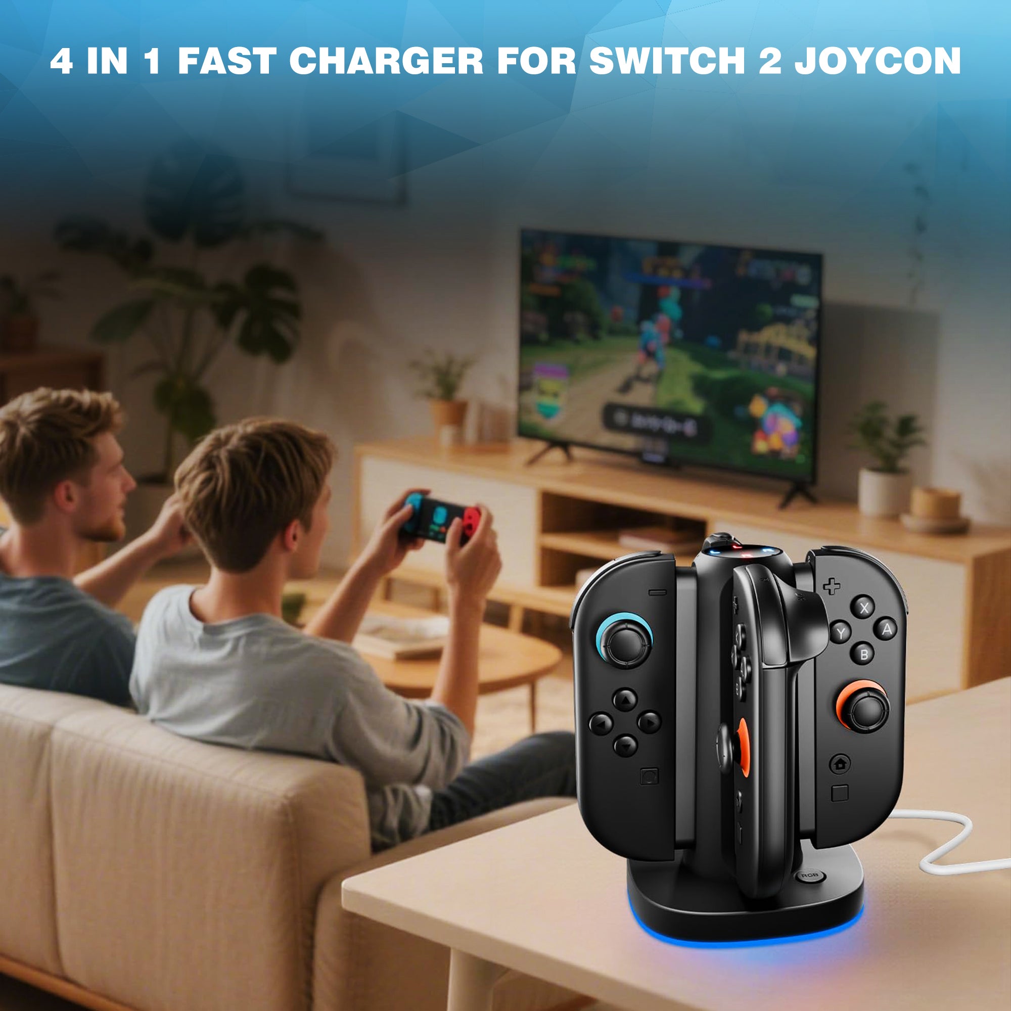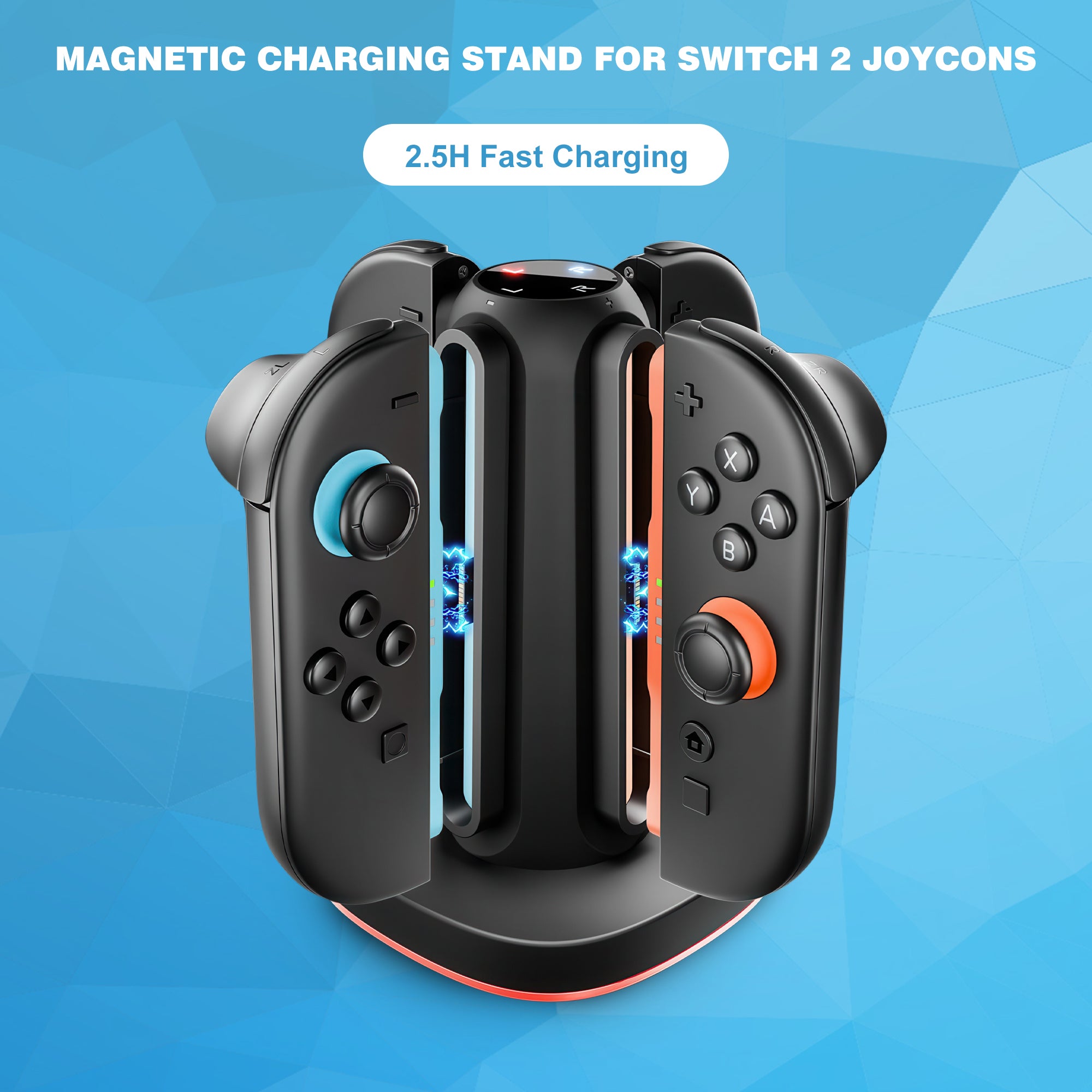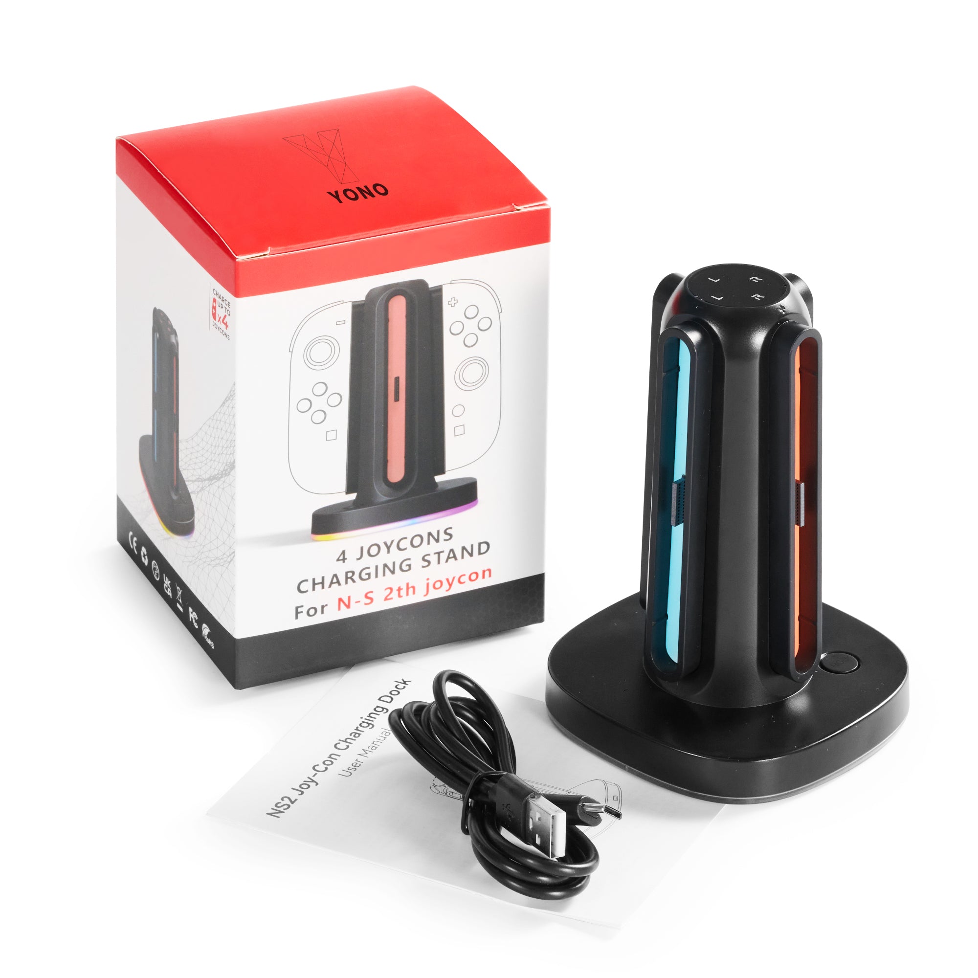 Laad tot vier Nintendo Switch 2 Joy-Con controllers tegelijk op met het compacte en stijlvolle YONO oplaadstation. Dankzij het magnetische design klik je de controllers eenvoudig vast en blijven ze stevig op hun plek. Met fast charging zijn ze binnen 2,5 uur volledig opgeladen. De kleurrijke LED-indicatoren tonen duidelijk de laadstatus en zorgen voor een extra sfeervolle toevoeging aan je game-setup.