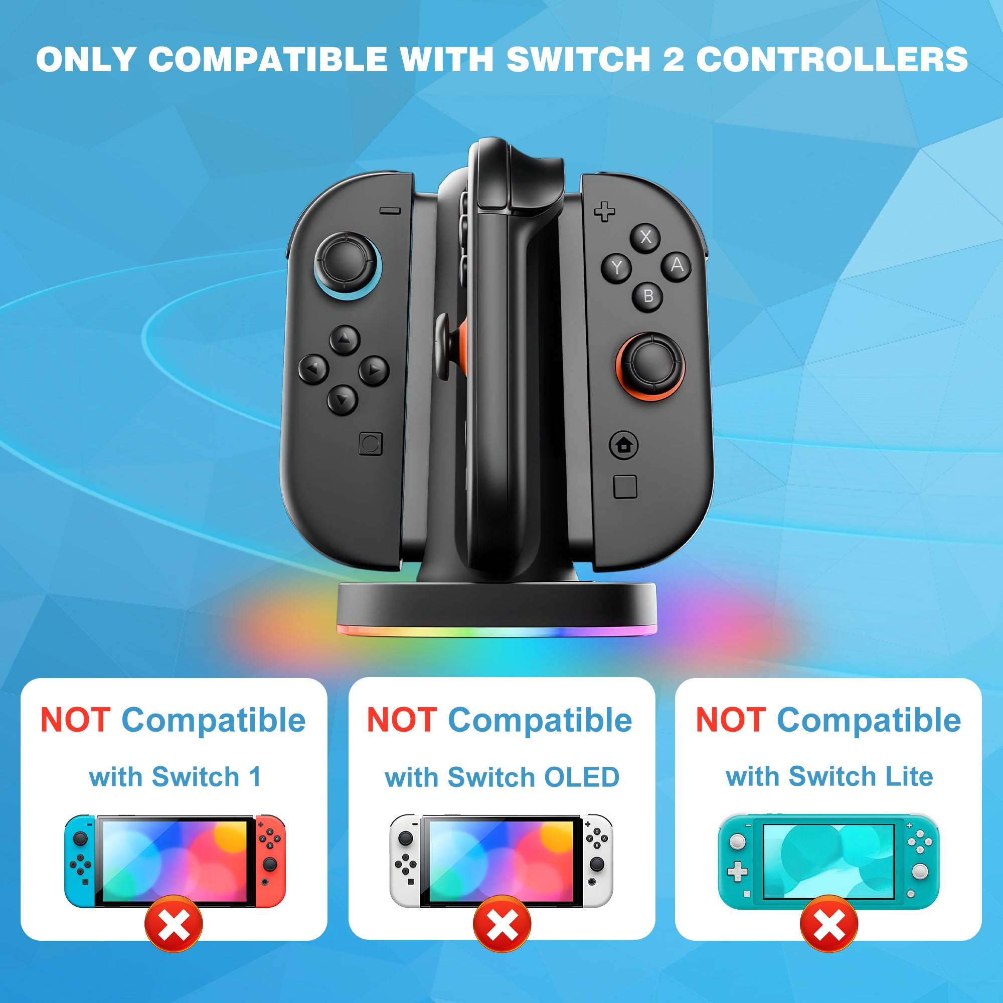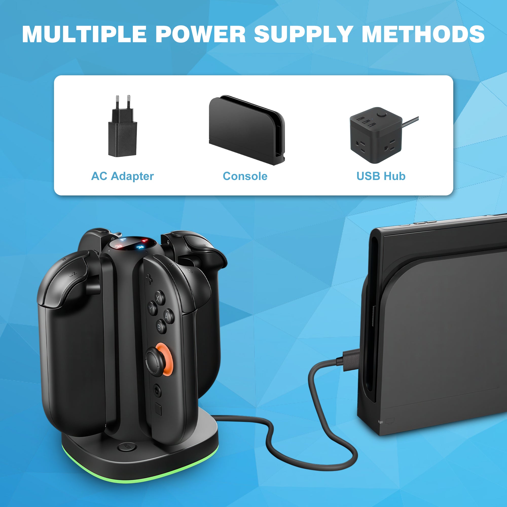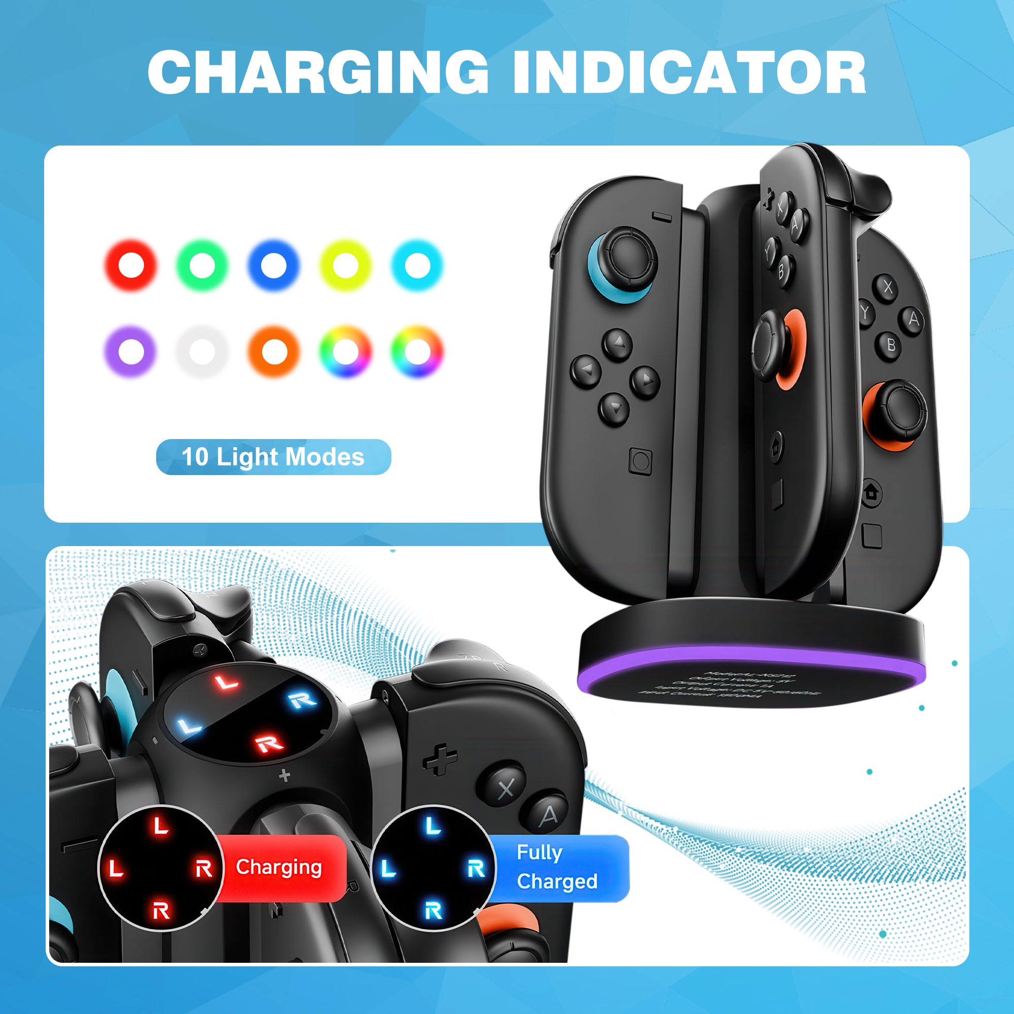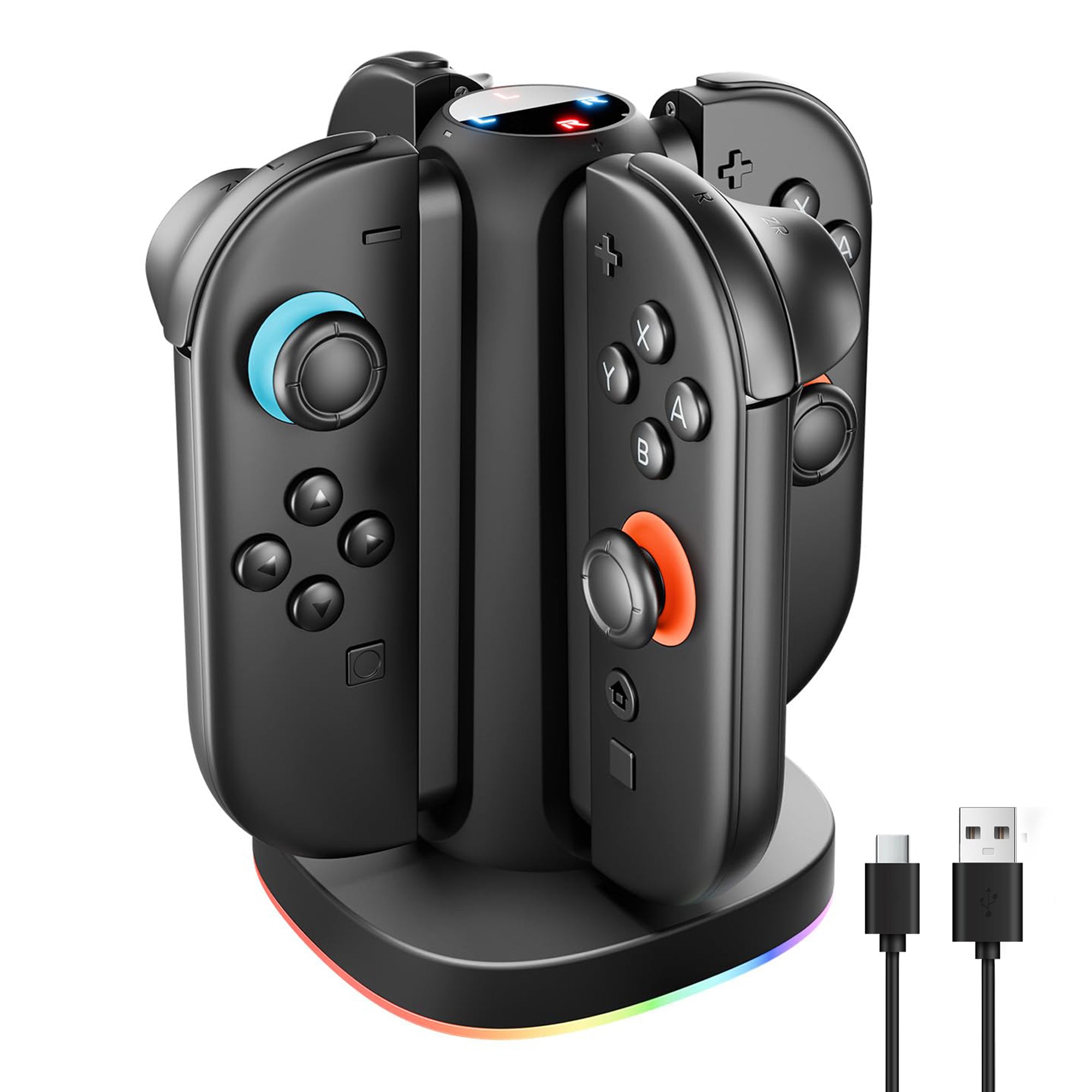 Laad tot vier Nintendo Switch 2 Joy-Con controllers tegelijk op met het compacte en stijlvolle YONO oplaadstation. Dankzij het magnetische design klik je de controllers eenvoudig vast en blijven ze stevig op hun plek. Met fast charging zijn ze binnen 2,5 uur volledig opgeladen. De kleurrijke LED-indicatoren tonen duidelijk de laadstatus en zorgen voor een extra sfeervolle toevoeging aan je game-setup.
