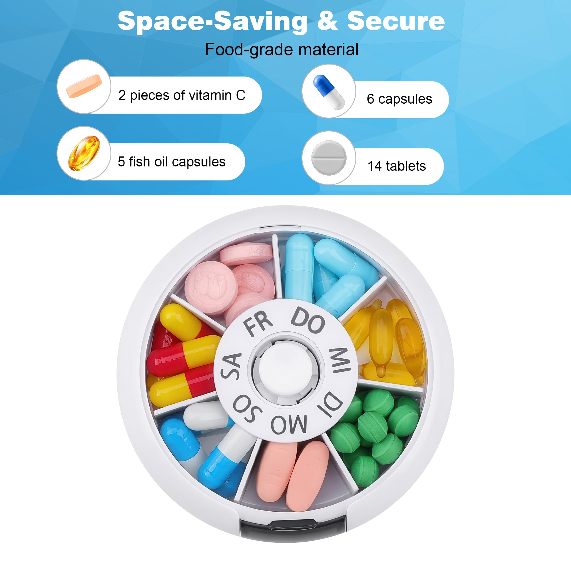 Neem je medicatie eenvoudig en overzichtelijk mee met het YONO Pillendoosje 7 Dagen Klein. Deze compacte pillenkoker voor een hele week is ontworpen voor dagelijks gebruik én voor onderweg. Dankzij het slimme ronde ontwerp met 7 afzonderlijke vakjes, elk gemarkeerd met een dag van de week, weet je altijd precies waar je aan toe bent. Het pillendoosje is klein, lichtgewicht en slechts 2 cm hoog, waardoor het moeiteloos in je jaszak, tas of handbagage past. Ideaal voor werk, reizen of een dagje weg. Gemaakt van BPA-vrij, voedselveilig materiaal, zodat je medicijnen veilig en hygiënisch worden bewaard.