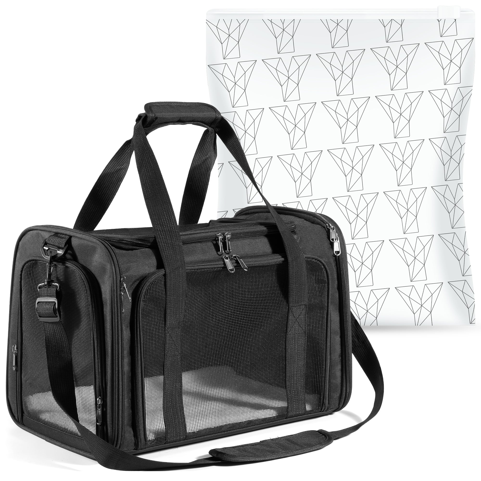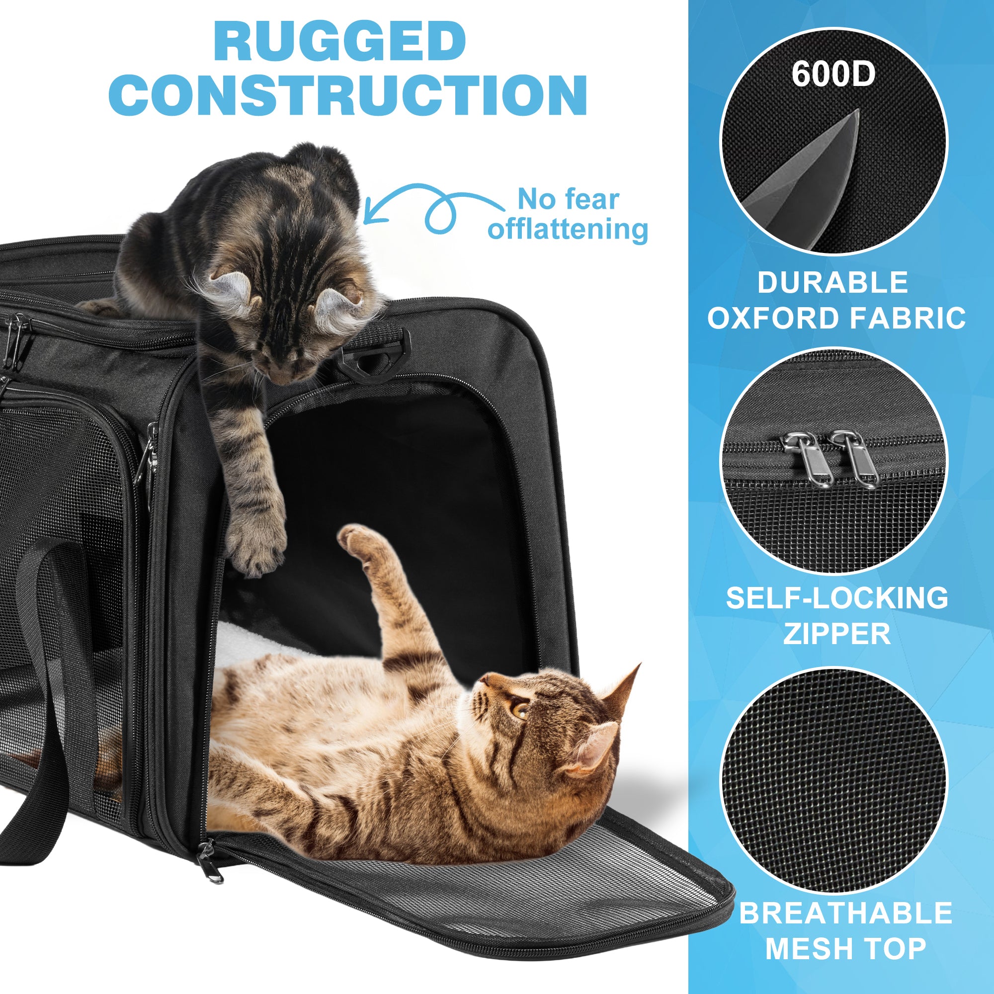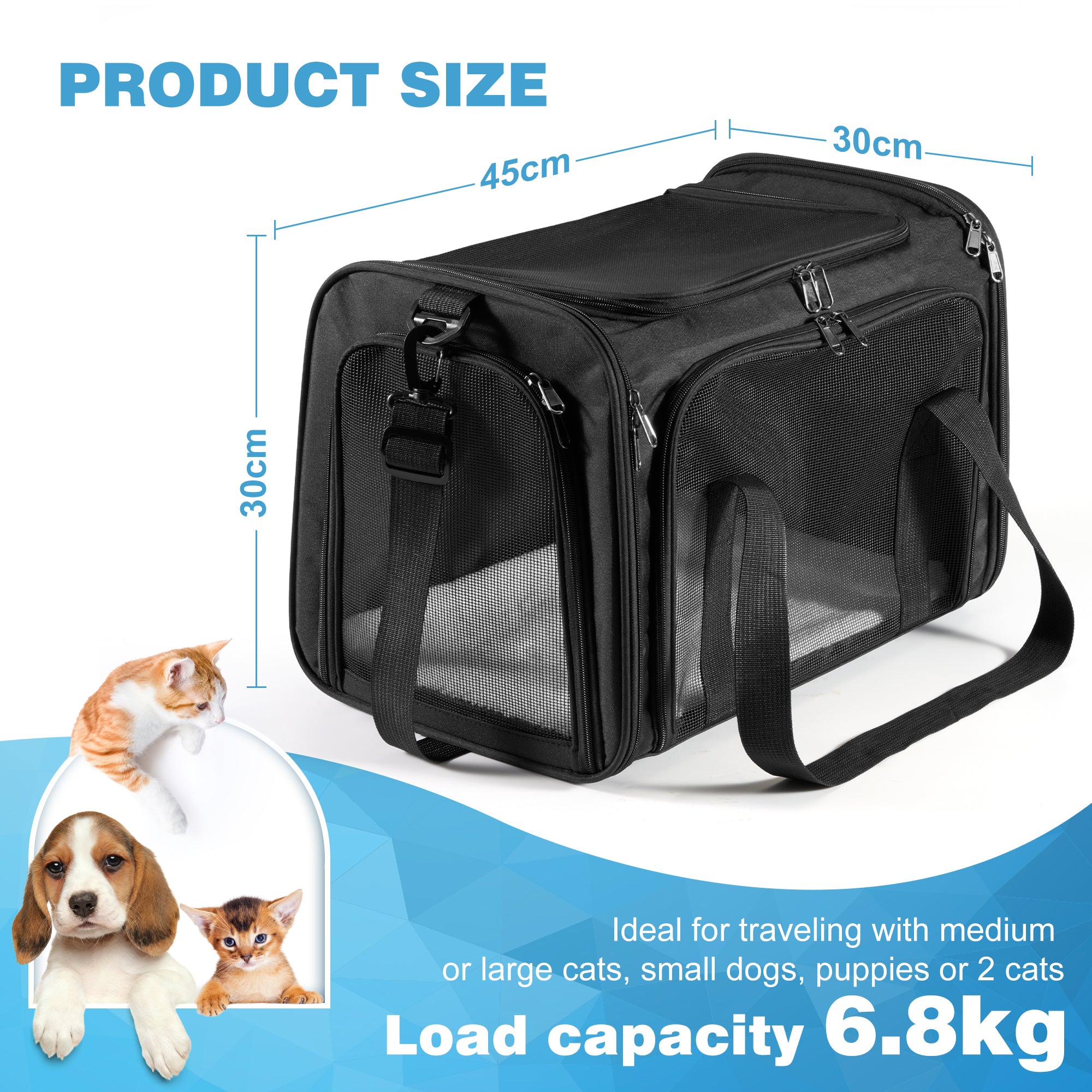 De transportbox is gemaakt van sterke 600D Oxford stof, wat zorgt voor een robuuste constructie die niet inzakt. Hierdoor behoudt de tas zijn vorm en heeft je huisdier voldoende ruimte om comfortabel te liggen of zitten. De driezijdige mesh panelen zorgen voor uitstekende ventilatie en geven je huisdier goed zicht naar buiten, wat stress vermindert tijdens het reizen.