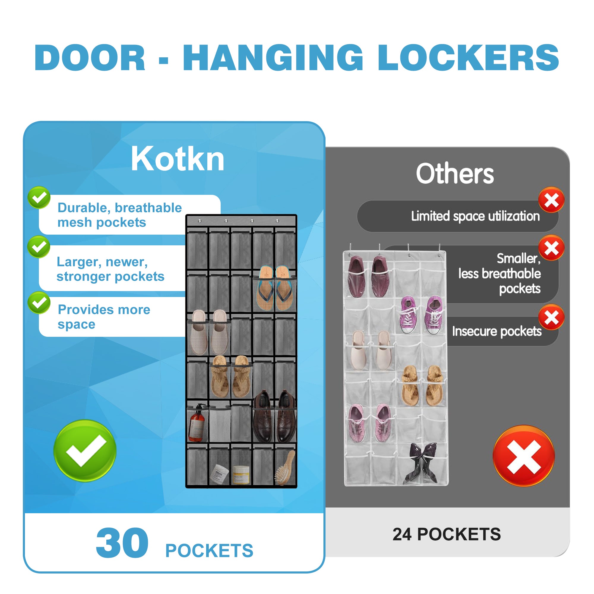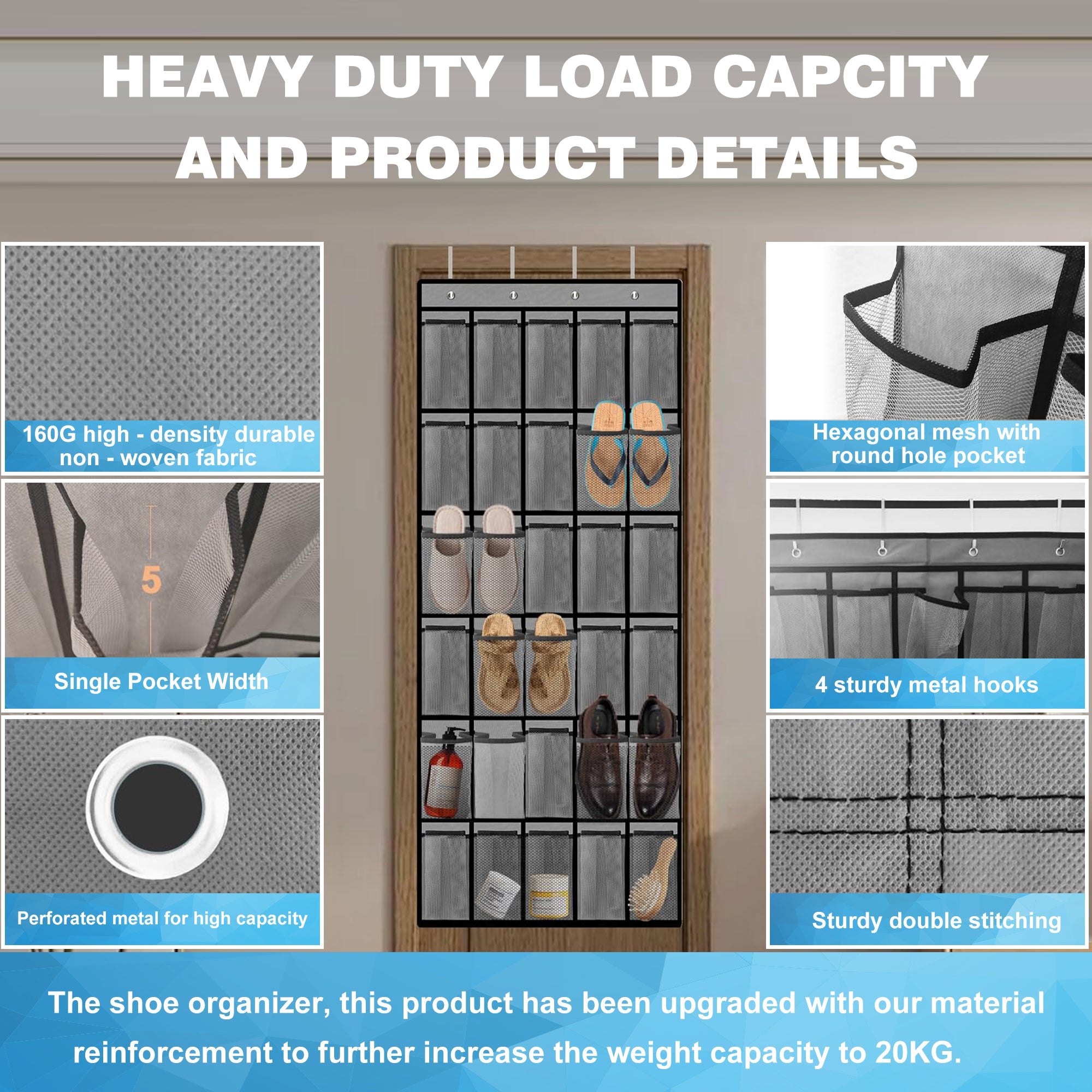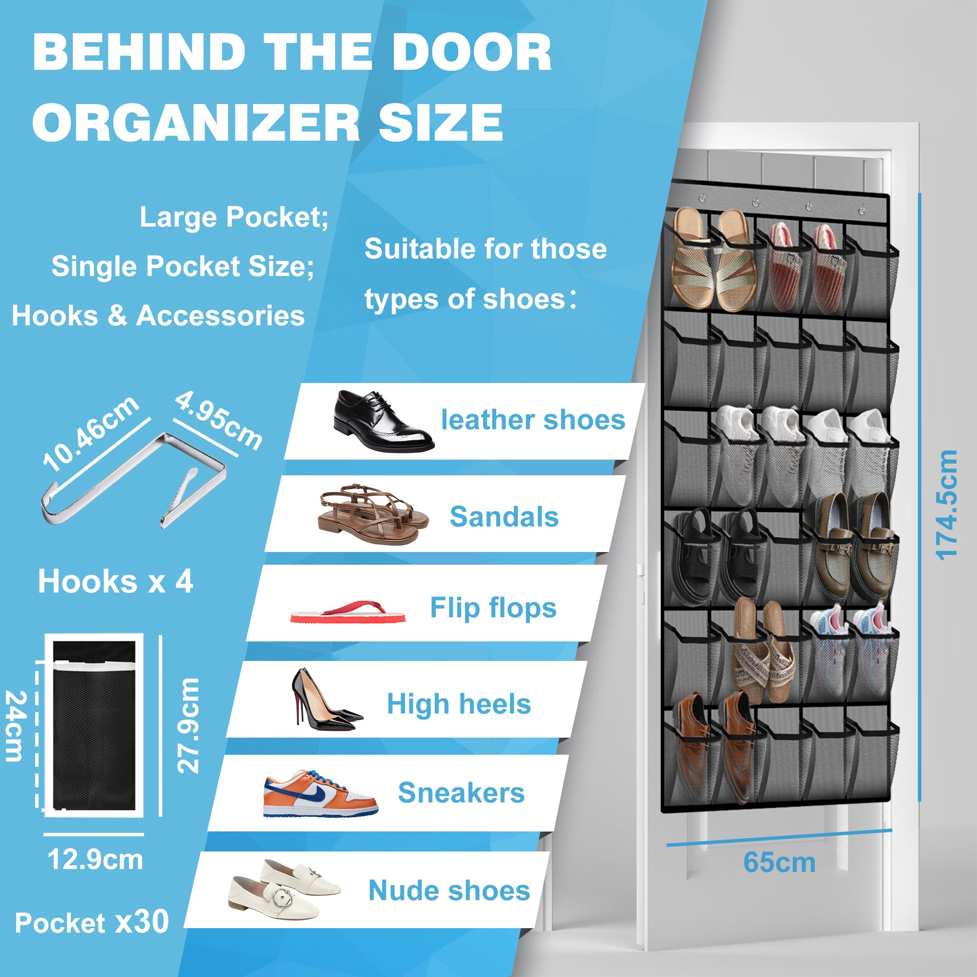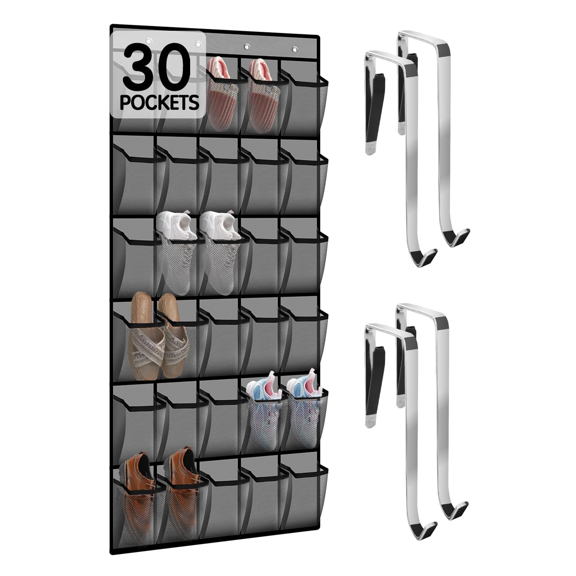 Deze schoen organizer voor aan de deur biedt een slimme oplossing voor het netjes opbergen van al je schoenen. Dankzij het duurzame non-woven materiaal en het ademende gaasontwerp blijven je schoenen fris, droog en vrij van stof. Met vier stevige metalen haken en versterkte ogen is de organizer eenvoudig op te hangen aan bijna elke standaard deur of kastdeur. De dubbel gestikte naden en sterke draagkracht tot 20 kilogram zorgen dat de organizer jarenlang meegaat – ook bij dagelijks gebruik. De 30 ruime vakken (24 x 12,9 cm) zijn geschikt voor allerlei soorten schoenen: